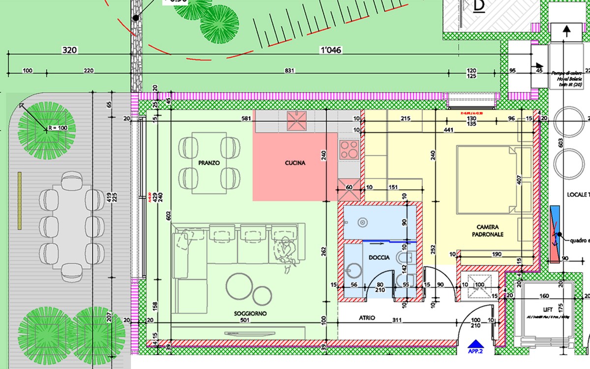 L’appartamento si comporrà di atrio d'ingresso, corridoio, soggiorno con cucina open space e accesso alla terrazza e al giardino, di una camera matrimoniale e di un bagno con doccia.