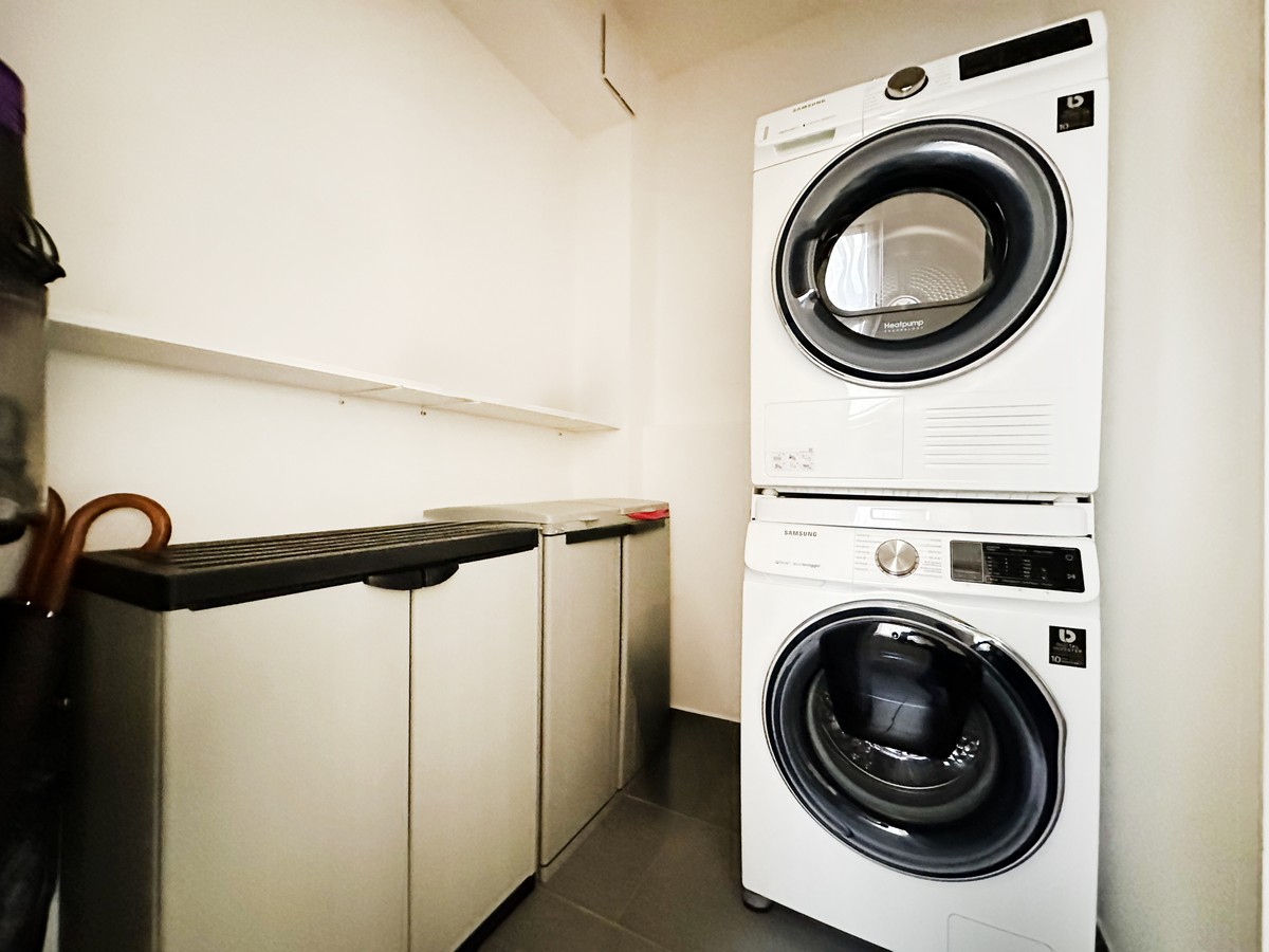 Un pratico sgabuzzino/lavanderia interno, completo di lavatrice, asciugatrice e ulteriore spazio di deposito, risulta estremamente funzionale e in grado di garantire un’organizzazione efficiente della casa e della gestione del bucato.