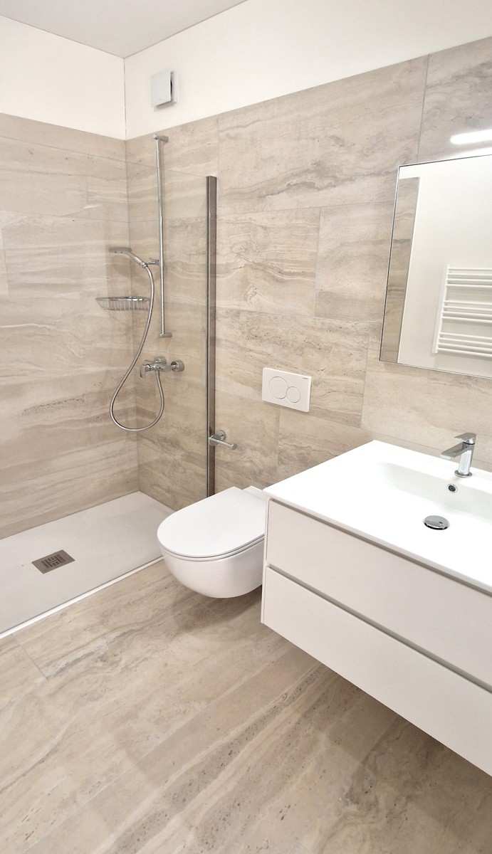 Edificato appena nel 2023, l’immobile presenta finiture di alto livello che includono pregiato parquet, rivestimenti di qualità nei bagni e armadi a muro su misura. Le parti comuni, come le scale rivestite a tutta altezza in travertino, testimoniano l’attenzione ai dettagli e l’elevato standing della residenza.