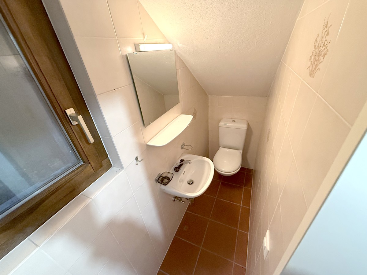 La spaziosa zona giorno è impreziosita da un caratteristico camino, in grado di offrire un'atmosfera romantica per piacevoli momenti di condivisione. Al piano superiore una camera matrimoniale è dotata di armadi a muro, mentre una seconda camera presenta una nicchia mansardata, regalando un tocco di originalità agli interni.