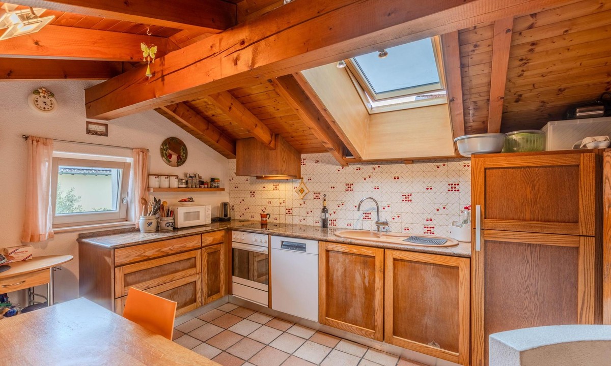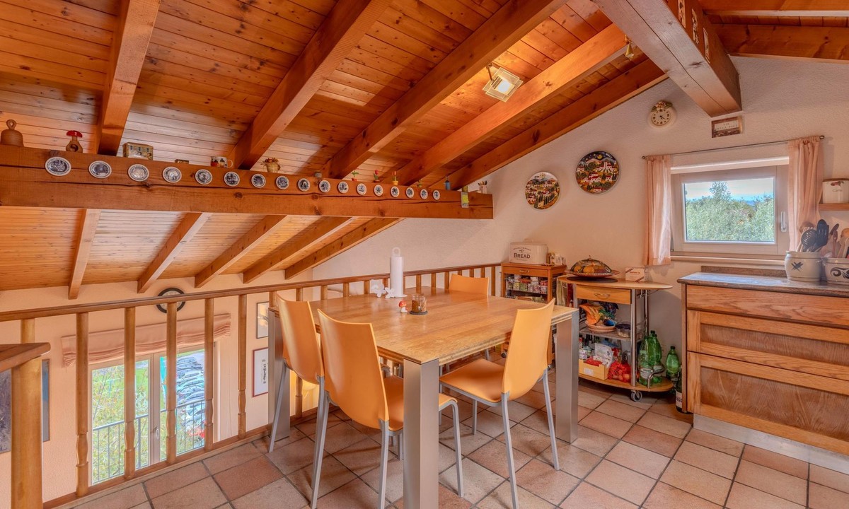 La cucina è situata al piano superiore e raggiungibile tramite una caratteristica scala a chiocciola. L'ambiente è in grado di offrire un design particolare grazie alla sua posizione a soppalco, uno spazio unico e accogliente per preparare i pasti.