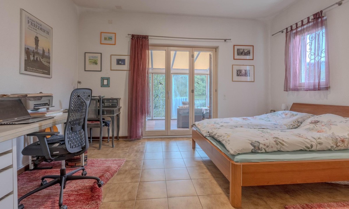 La camera matrimoniale al piano inferiore si affaccia su un ampio terrazzo verandato godibile tutto l'anno, creando uno spazio intimo e riservato per il riposo.