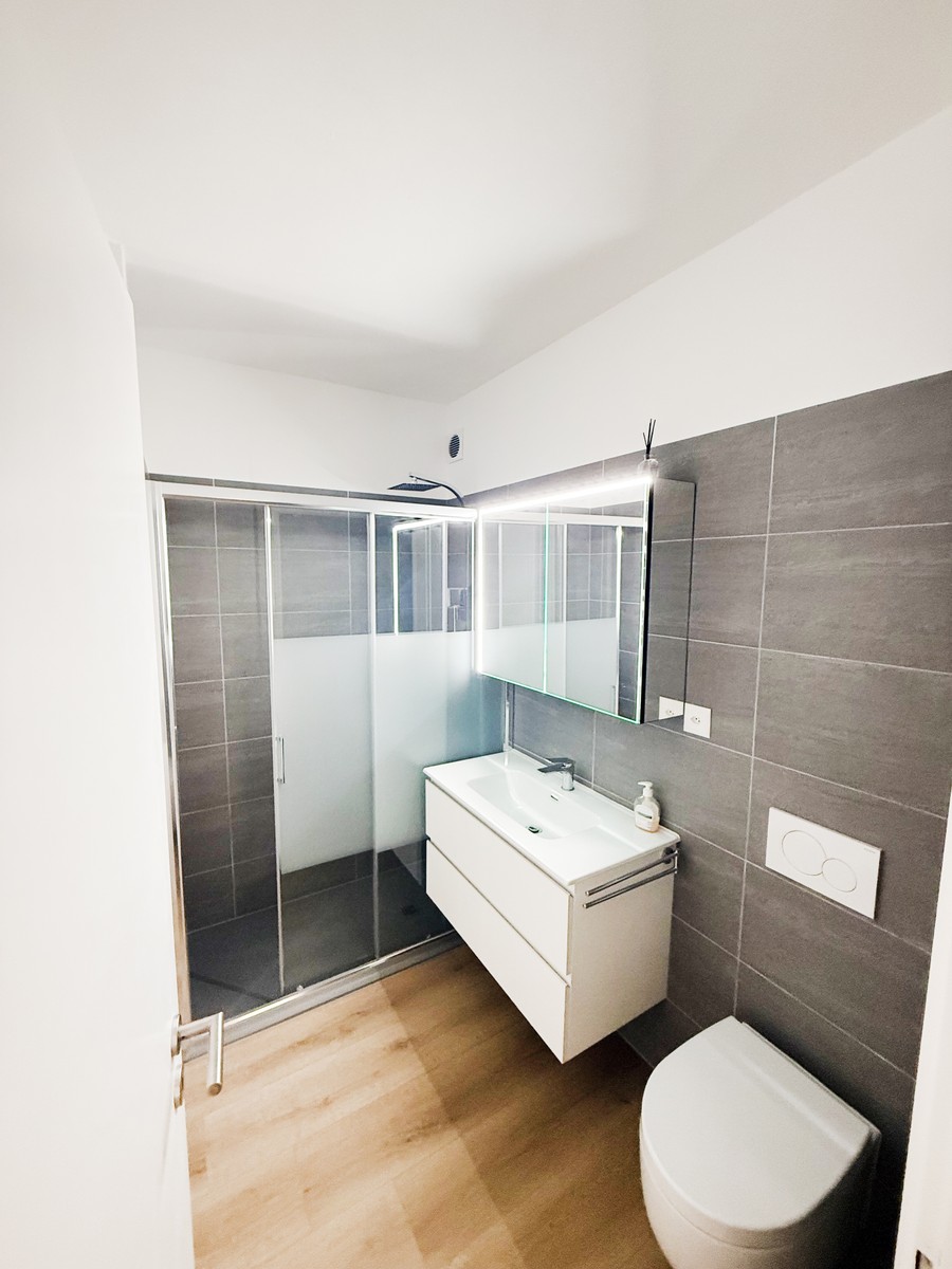 Il bagno, dotato di armadio a specchio a muro, unisce utilità e linearità, diventando uno spazio facile da vivere e da mantenere in perfetto ordine.
