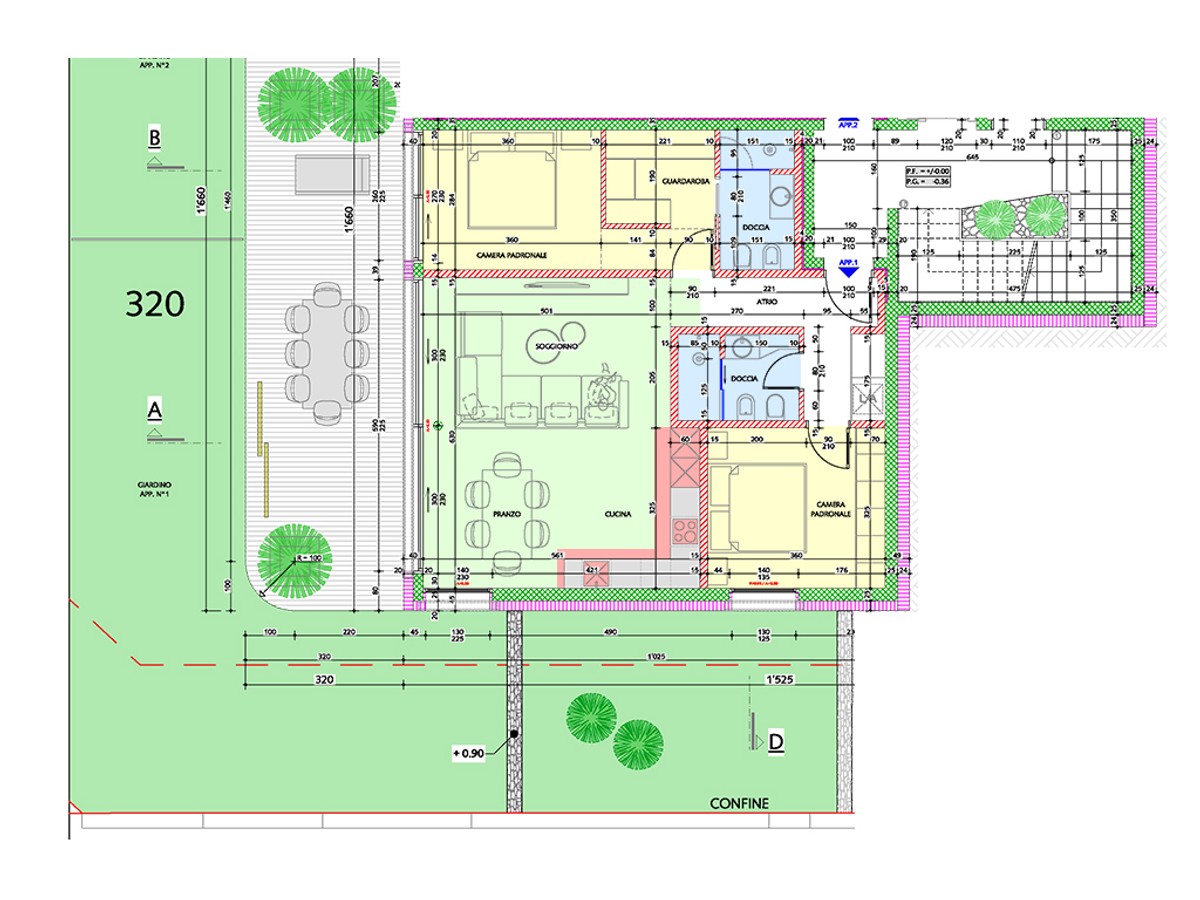 L’appartamento si compone di soggiorno open space con cucina e accesso alla terrazza e al giardino, di due camere matrimoniali di cui la principale con guardaroba e bagno ensuite e di un secondo bagno con doccia.