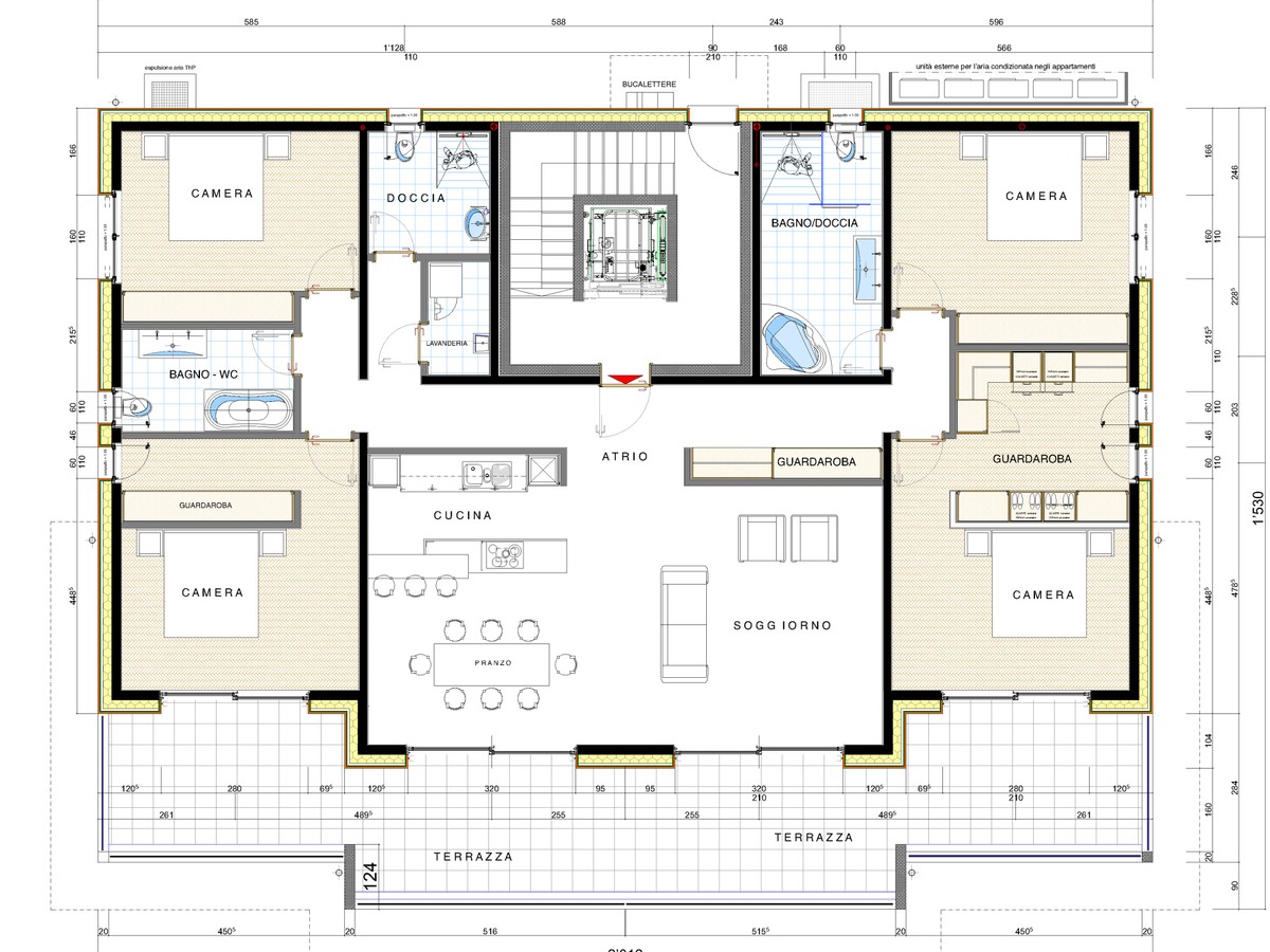 Il riscaldamento sarà provvisto da un efficiente sistema a termopompa con diffusione a serpentine, integrato da pannelli solari e aiutato da serramenti in alluminio esterno e legno interno.