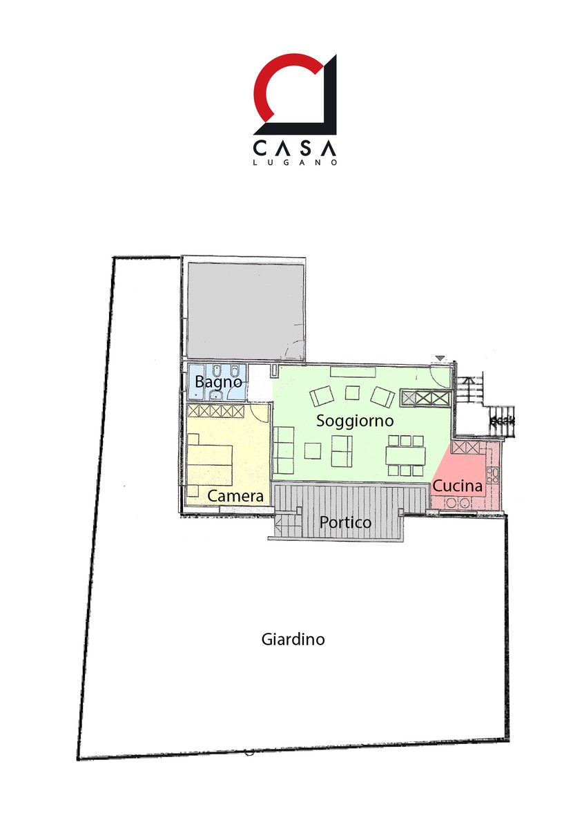 L'appartamento si compone di ingresso, ampia zona giorno con soggiorno, cucina open space e accesso al portico e al giardino privato, di una camera da letto matrimoniale, di un bagno finestrato con doccia e del locale separato con accesso indipendente.