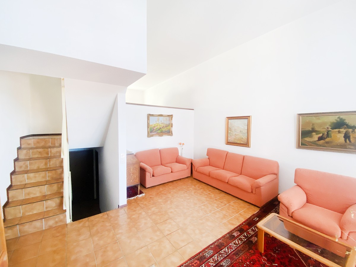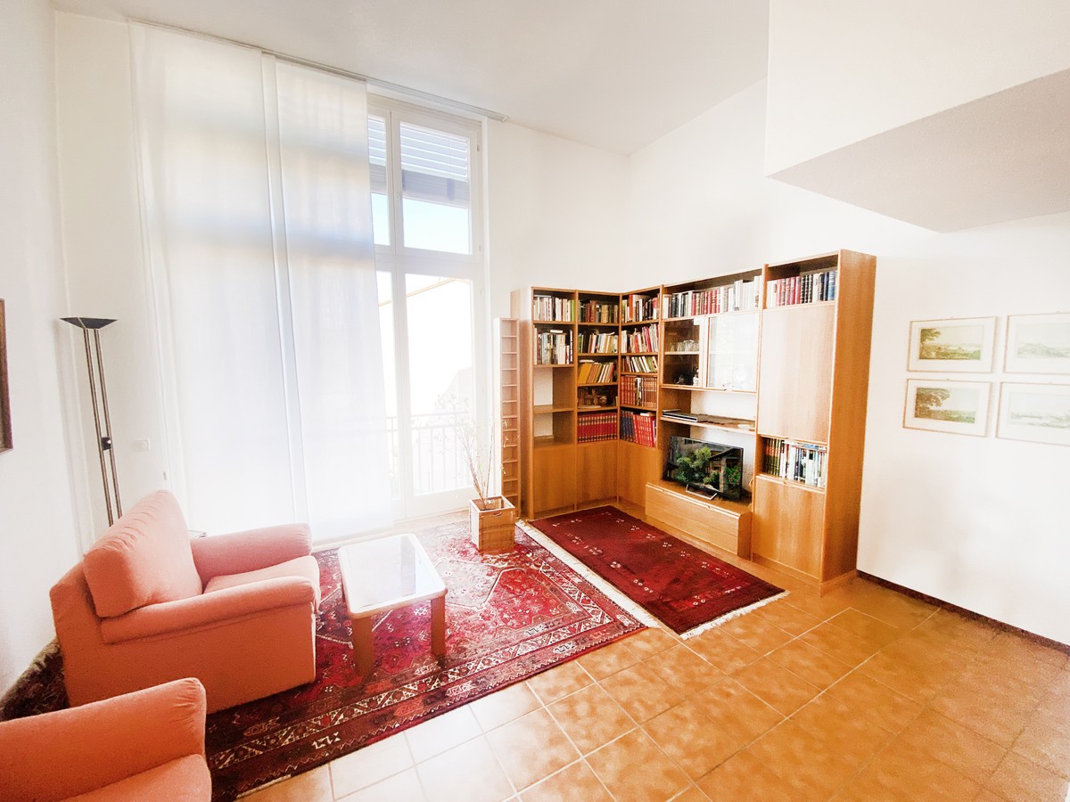Il soggiorno è caratterizzato da soffitti molto alti e da una configurazione duplex insieme alla zona pranzo per uno spazio abitativo di grande impatto e originalità. La zona pranzo, ampia e spaziosa, si affaccia sul soggiorno sottostante creando una continuità visiva molto suggestiva.