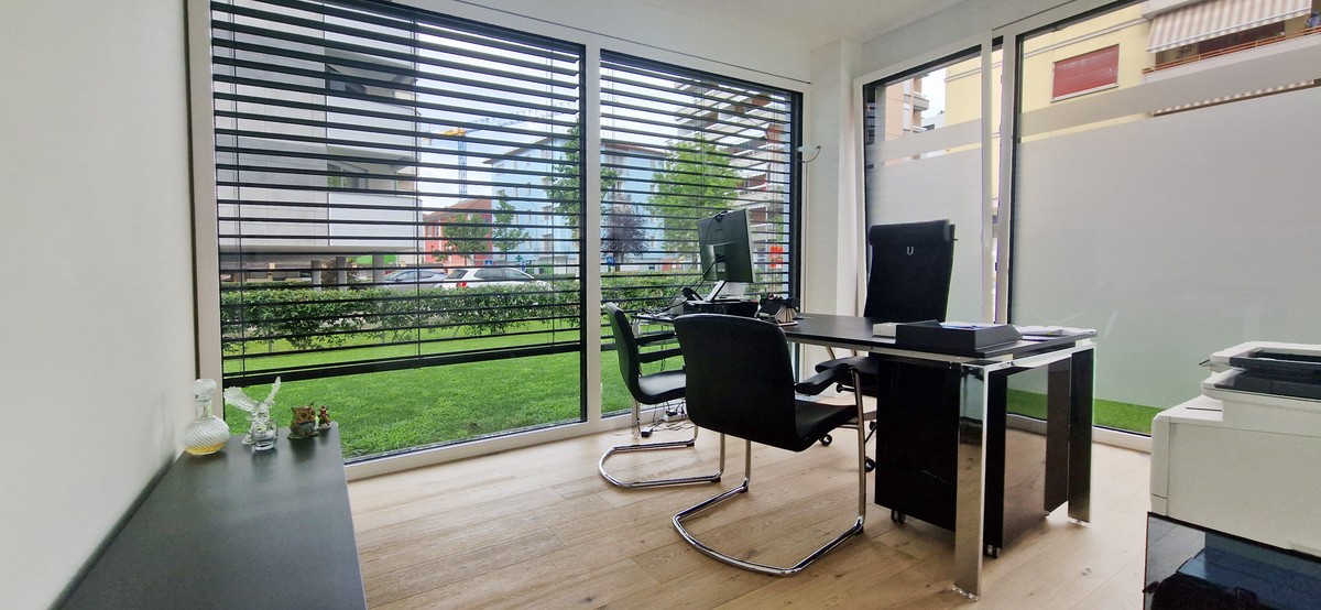 Ogni locale dell'ufficio è dotato di un'ampia vetrina con affaccio sul giardino e di una porta finestra per accedere direttamente allo spazio verde per una situazione dalla grande visibilità ma anche molto luminosa e davvero a misura d'uomo.