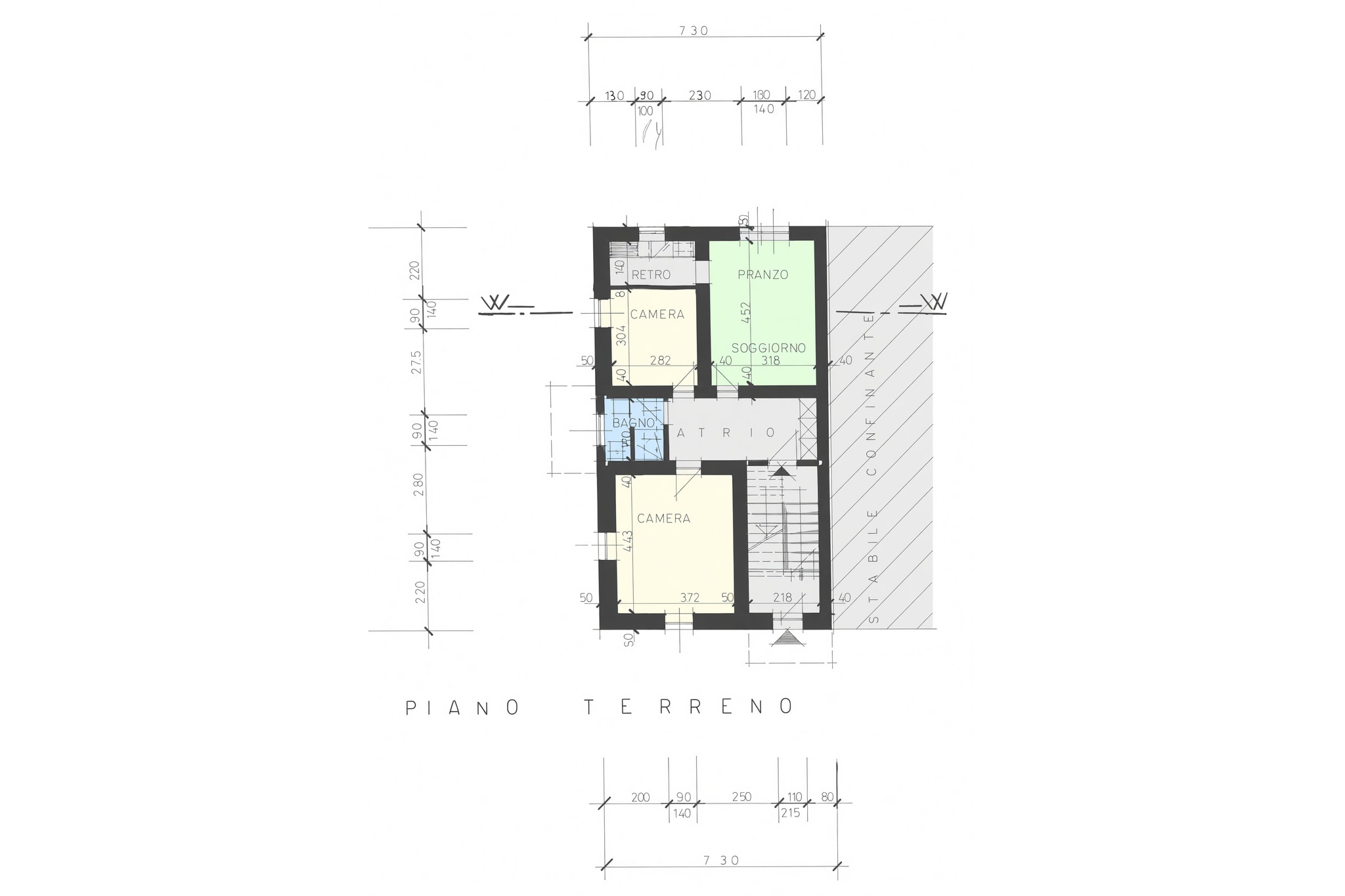 L’immobile si compone al pianterreno di un appartamento di 3 locali con cucina e zona pranzo/soggiorno, una camera matrimoniale, una stanza utilizzabile come soggiorno più grande oppure come seconda camera da letto, un bagno finestrato e ingresso con armadiatura a muro; il primo piano ospita un secondo appartamento di 3 locali dalla medesima composizione e il secondo piano accoglie infine un terzo appartamento di 3 locali anch’esso con la stessa distribuzione interna.